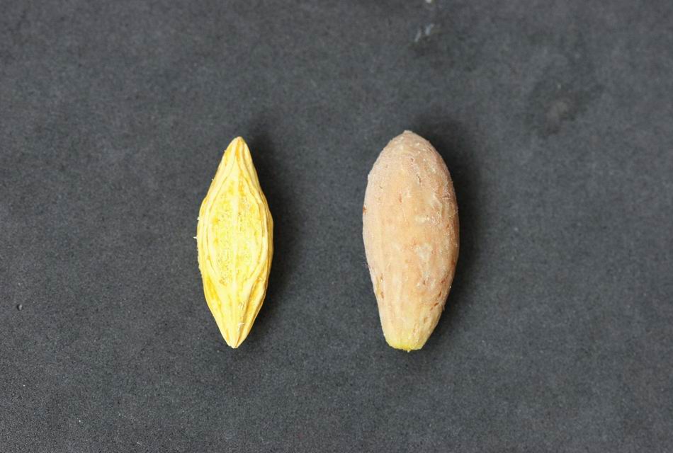 | ‧果: | 果實於十二月至翌年二月間成熟,核果,橢圓形,極似橄欖,每果重約 15~30 公克,外果皮呈暗綠色,光滑,果肉淡綠色,味甜酸澀,水分少,或切片鹽漬糖製或乾製,或製果汁果醬,種仁富含油分約佔核仁 32%,可製中等潤滑油。 |