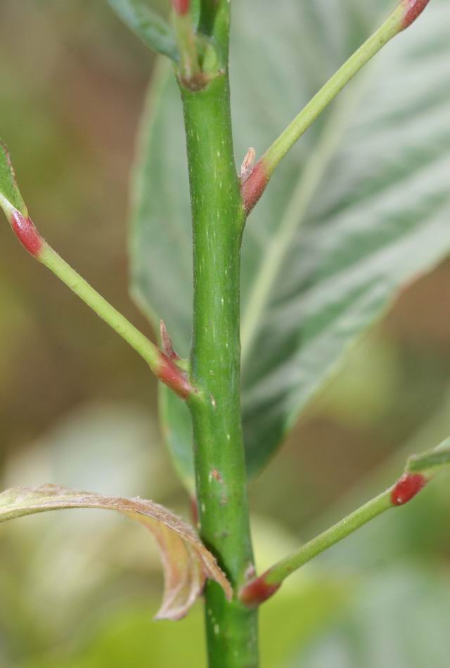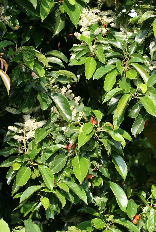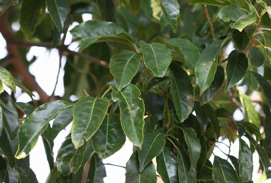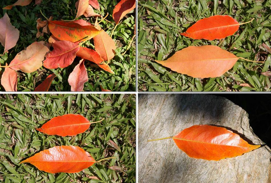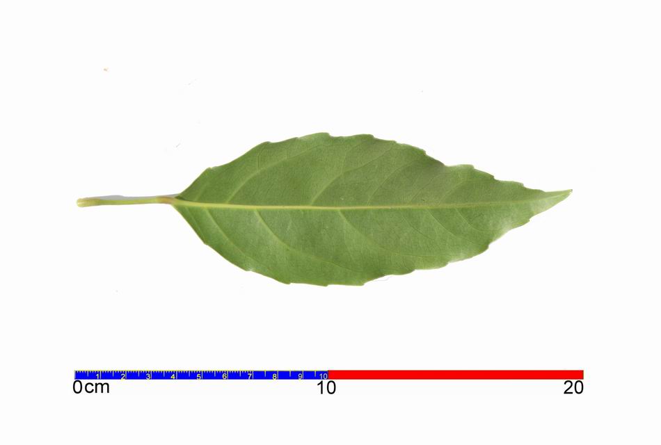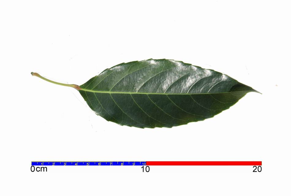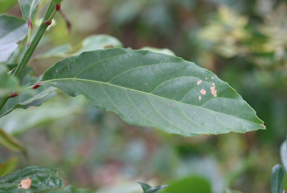 | ‧葉: | 葉互生,長橢圓形,基部尖銳,頂端鈍,邊緣鋸齒,長約 10~19 公分,寬約 4~8 公分,表面濃綠色,兩面均光滑,厚紙質,中肋及側脈於背面凸出;葉有長柄,兩端膨大,嫩葉淡赤色,老葉將落前則呈橙紅或鮮紅色。 |