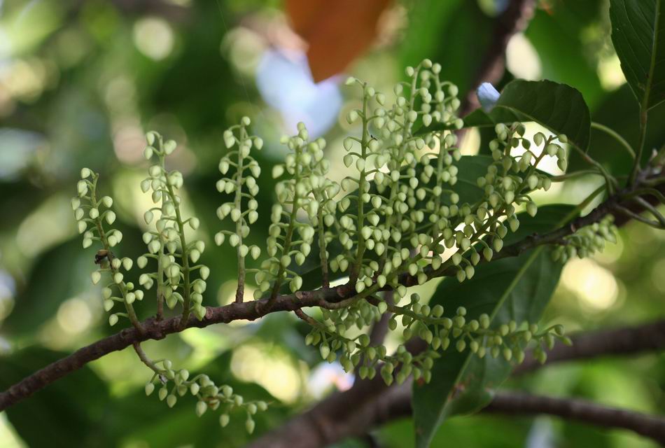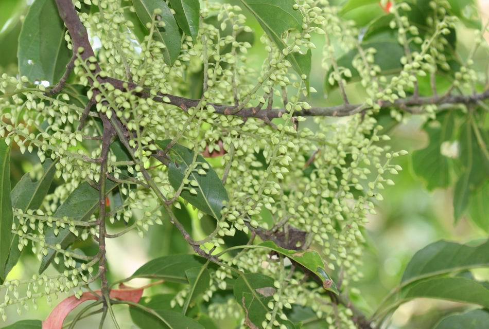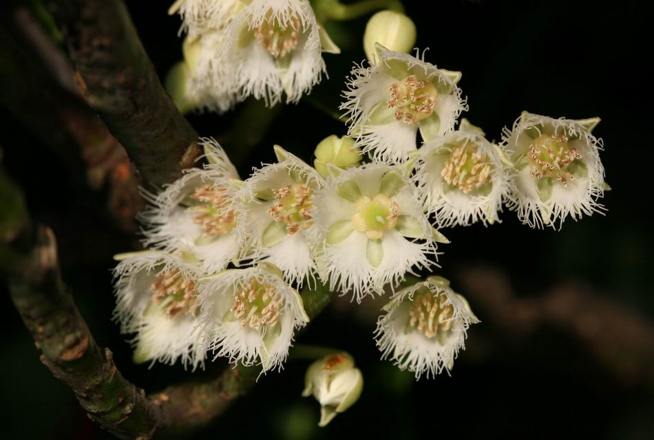 | ‧花: | 花瓣先端成絲狀分裂,花盤為腺體狀,雄蕊 20~35 枚,六月上旬抽蕾,七月中旬至九月上旬開雪白色小花,呈總狀花序,蜜蜂為主要授粉媒介。 |