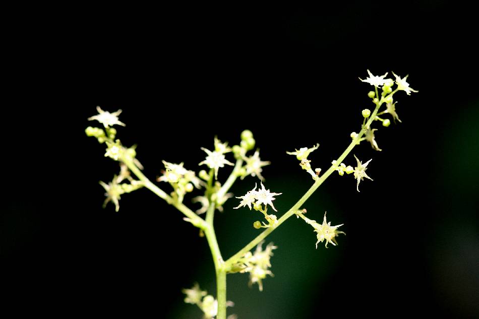 | 雌雄異株,圓錐花序,花冠黃綠色,五裂,具有小苞片;花萼短,5 裂;雄蕊 5,花絲極短,聚合成筒,每一雄蕊 2 花藥,藥室直立;子房球形,花柱三枚。 |