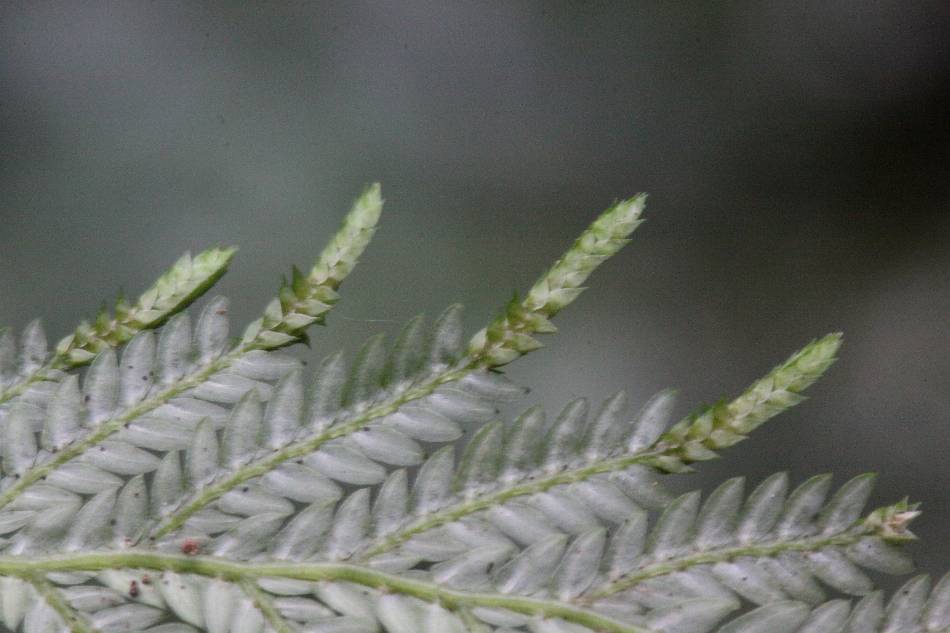 | 孢子葉同型,卵狀三角形,龍骨狀,葉尖漸尖形,全緣,有狹邊,成四列覆瓦狀排列於枝梢,形成孢子葉毬;毬長 0.3~3 公分。孢子期秋、冬間。 | |