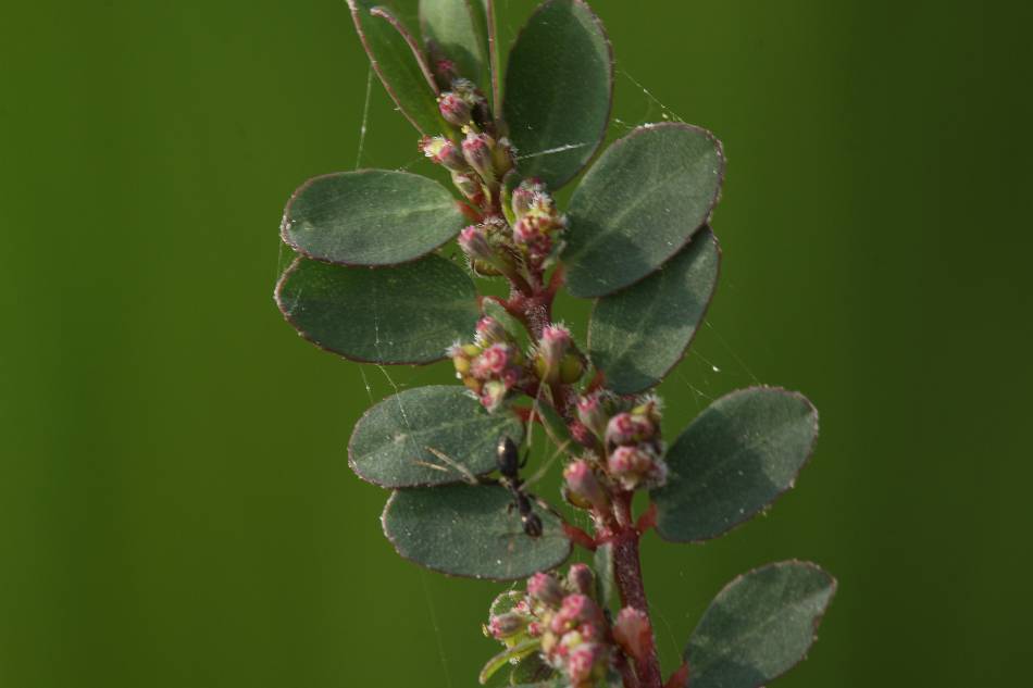 | 花腋生或頂生,幾無梗,聚繖花序,排列成頭狀;總苞陀螺狀,花密而小,為紅紫色苞片所包圍,長約 0.1 公分,具腺體 4 個,漏斗狀,綠色;花單性,無花被;雌雄 花同生於總苞內,雄花 1 枚,雌花 1 枚,生於花序中央,子房 3 室,花柱 2 枚,離生而頂端 2 裂。花期 3~10 月。 | |