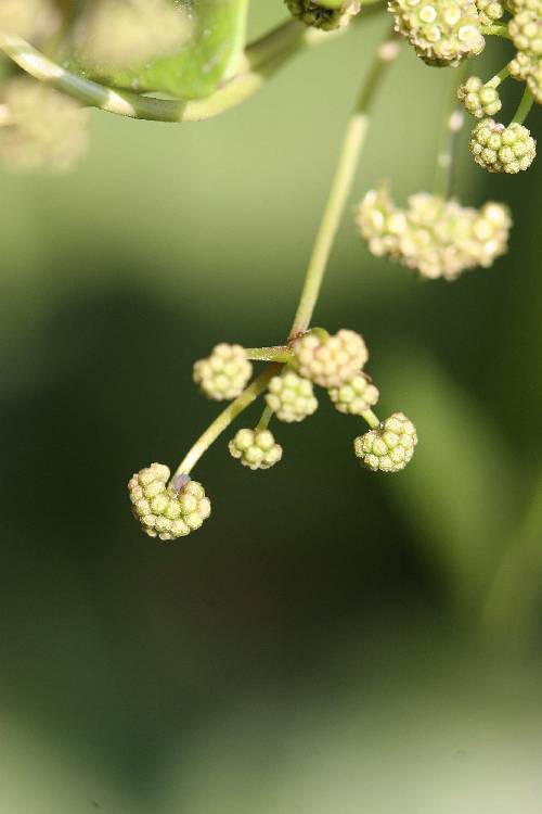 雌雄異花異株。花自枝梢葉腋萌發,小形,呈複繖形花序,淡綠白色,雄花萼片 6~8 ,花瓣 3~5,雄蕊 6,合生;雌花萼片和花瓣 3~5 ,花柱 3-6 裂,外彎。花瓣 3~6 枚。