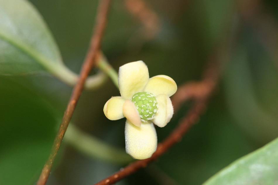 春季開花,花單性,雌雄異株,花朵單生於葉腋,呈下垂樣,花徑約 0.4~0.6 公分;花梗長 0.8~1.5 公分,有時在雌花時亦可達 4 公分;花被片 8~13 枚,肉質,淡黃色或白色,有時亦有呈較深的黃色,有腺點,通常排成 2~3 列;雄花中雄蕊聚合成球形或卵形,徑 0.5~0.7 公分,有雄蕊 25~30 枚,排成 6~8 列,藥隔甚寬闊;雌花心皮 40~50 枚,聚合為球形,約排成 4 列。