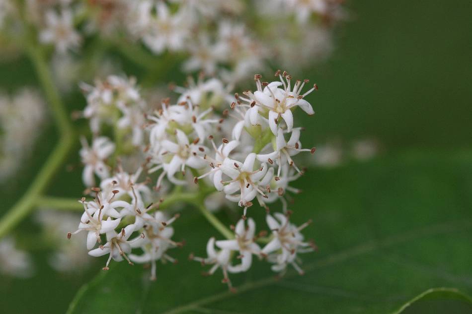 圓錐狀聚繖花序頂生,近無毛;花冠鐘形,白色,裂片長圓形,雄蕊 5,生於花冠管中部,花柱頂端分枝,花瓣長 0.35~0.55 公分。