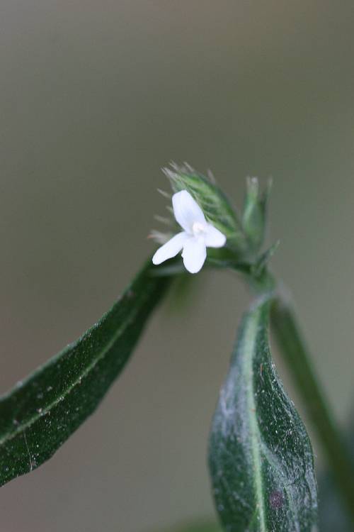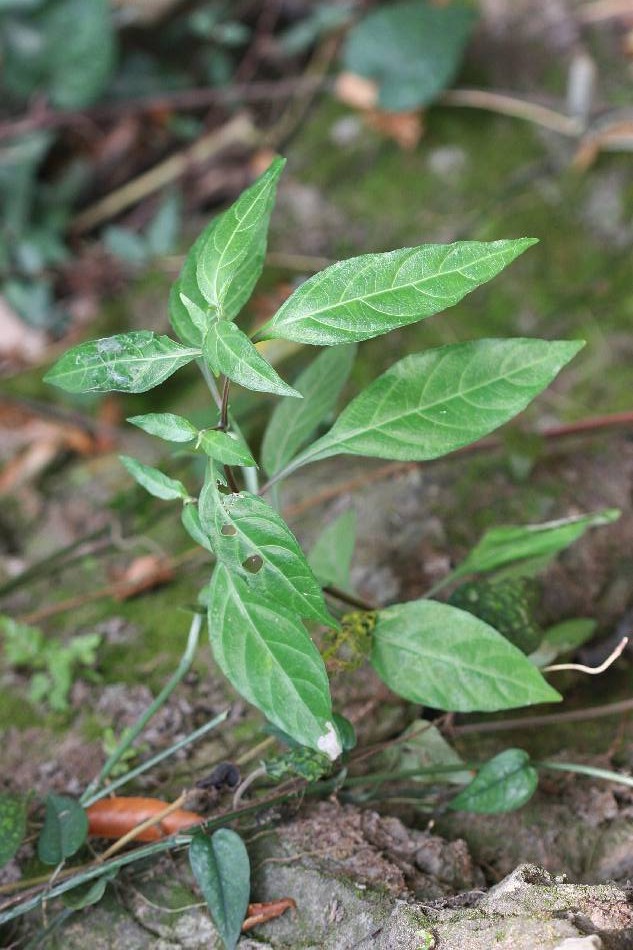 單葉對生,長橢圓形或卵狀披針形,脈上被疏毛,膜質,長 8~10 公分,葉柄長 2.5 公分。