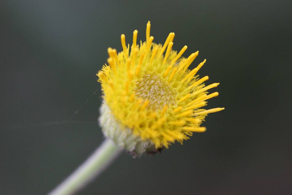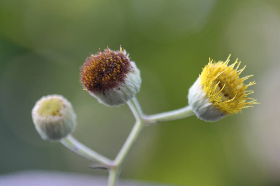 | 頭狀花序呈緊密圓錐狀排列,頂生或腋生,2~5 朵排裂成疏繖房狀;總苞長 0.7~0.9 公分,寬約 2 公分,呈半球形;總苞片覆瓦狀排列,5 輪,外層總苞片短,革質,長橢圓形,先端鈍,內層總苞片薄且呈線形;雌性花長約 0.5 公分;兩性花長約 0.6 公分,裂片被毛。總苞碩大, 所以稱為『大頭』,先端帶紫紅色,心花黃色。多半在秋冬之際開花。花期自 10 月至 12 月。 | |
