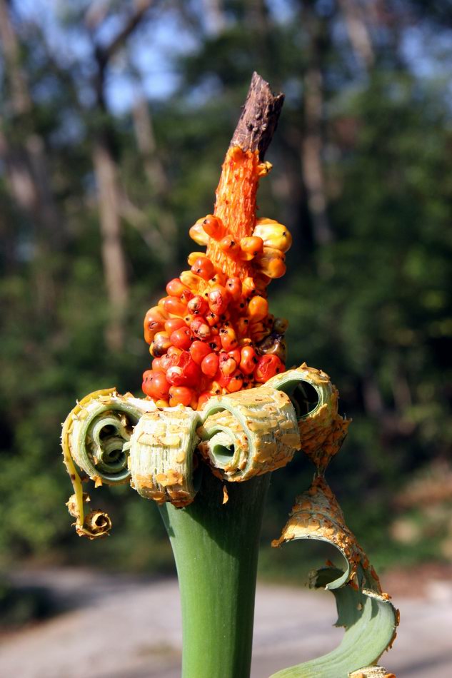 花序柄常單生;春季開花,佛焰苞肉質,綠色;雌花在下,雄花在上,中央為中性花。