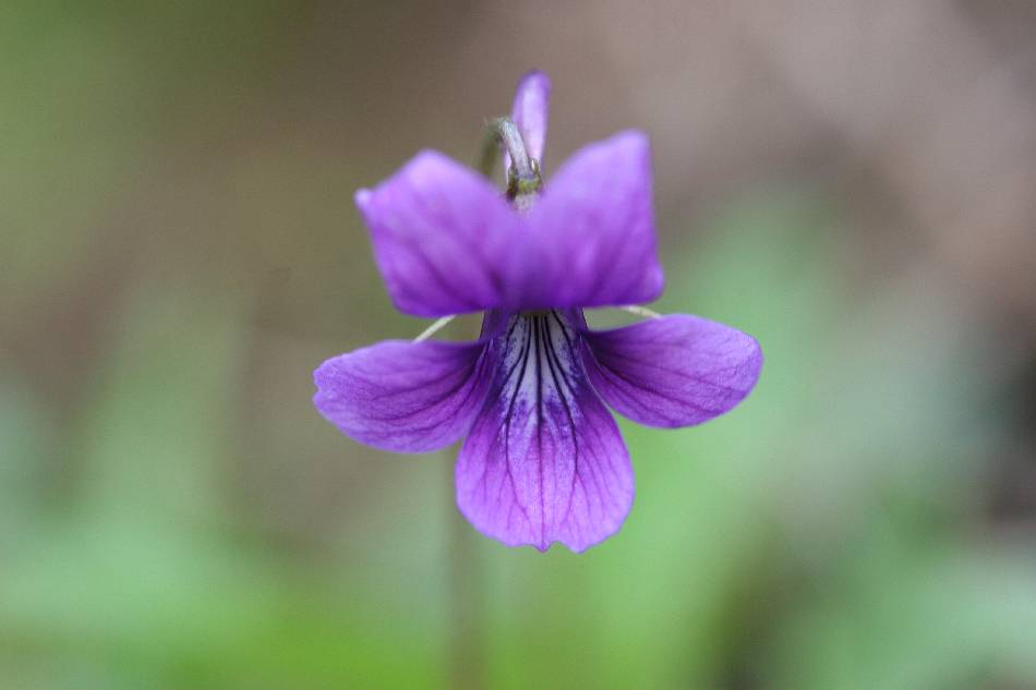 花單生,暗紫色,有明顯脈紋,開放時徑 1~1.5 公分,花梗長 4~10 公分,常較葉為長,光滑無毛或略有毛茸;萼片 5 枚,披針形至卵狀披針形,長 0.3~0.4 公分,寬 0.1~0.15 公分,先端漸尖或銳尖,光滑無毛;附屬物半圓形,長 0.1~0.2 公分,先端漸尖,邊緣有缺刻;花瓣 5 枚,倒卵形,長 0.8~1.2 公分,寬 0.3~0.45 公分,先端鈍,側生花瓣有鬚毛;唇瓣先端凹或截斷狀,距細長,長 0.3~0.4 公分,直條形,先端鈍;花柱細長,長 0.15~0.2 公分,明顯呈棍棒狀,先端柱頭呈喙狀。
