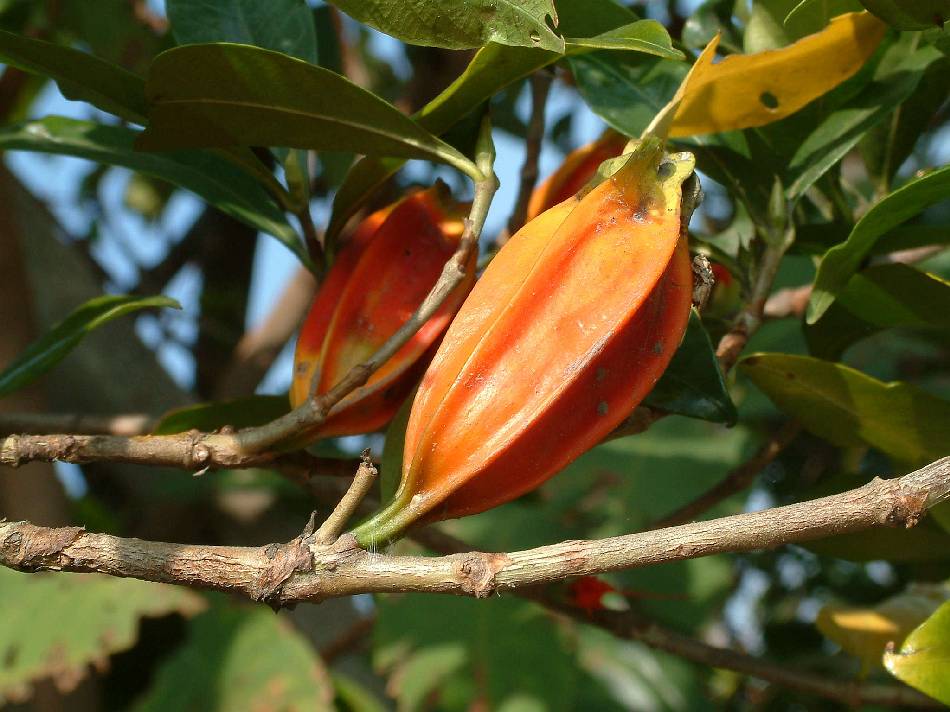 | 果實為漿果,卵形或橢圓形,徑 1.5~2.5 公分,具 5~8 稜,宿存萼片冠狀;成熟時橘黃色或橘紅色;種子多數,隱藏於肉質的胎座上。 |