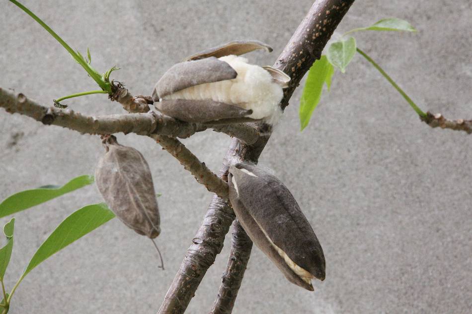 蒴果橢圓形,長 12~16 公分,寬 5~7 公分,熟時五瓣裂,木質;內具棉毛及種子,種子黑褐色,密被長棉毛,倒卵形,光滑,徑約 0.2~0.4 公分,寬約 0.2 公分,種子被絲狀毛茸所包藏。