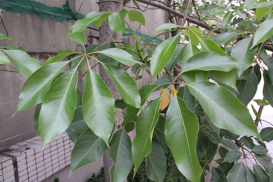 葉互生,多叢集於枝條的先端,掌狀複葉;小葉 5~7 枚,長橢圓至卵狀長橢圓形,長 10~20公分,寬 4~6公分,先端銳尖,基部楔形或略鈍,紙質,葉緣有疏鋸齒,表面為有光澤的綠色,背面淡綠色,表裏兩面皆光滑無毛;小葉柄長 3~5 公分,內面有溝紋;葉柄長 14~18 公分,平滑;冬季落葉。