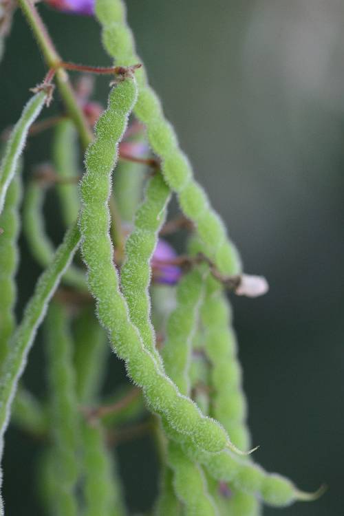 莢果線形,稍彎,4~5 公分,暗褐色,沿上縫線有較淺的向內凹,下縫線則向內凹至寬的 1/4 左右處,有 6~12 節,密生黃色鉤毛,節易斷落,但不裂開。成熟後斷裂,可沾附在動物身上,代為傳播種子。