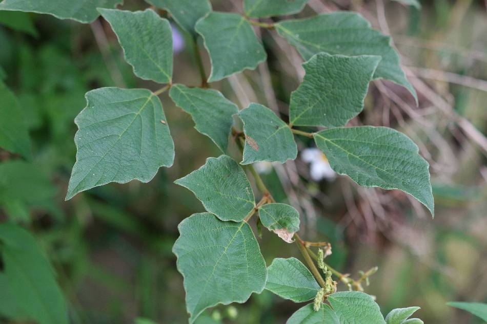 葉為羽狀三出複葉,大形,頂生小葉卵形、菱狀卵形、長橢圓形,長 4 ~10 公分,寬 3~7 公分,先端銳尖或漸尖,基部寬楔形,葉緣呈明顯的波浪形,兩面均被毛。