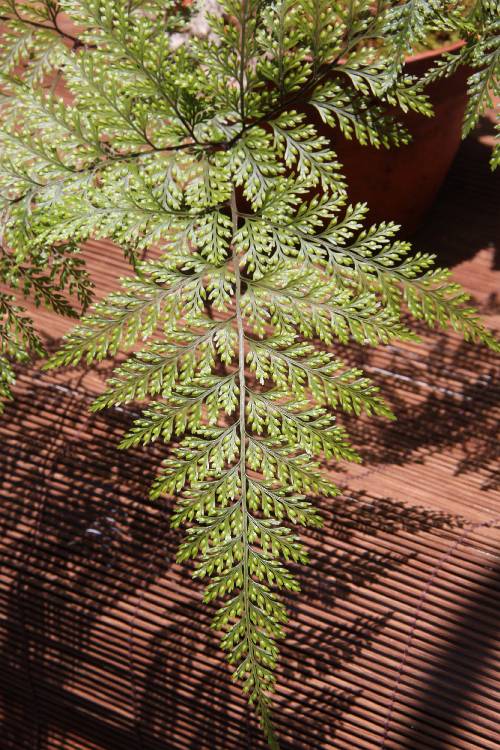 | 二至三回羽狀複葉,散生;葉柄長 8~10 公分;葉片長 15~30 公分,寬 12~25 公分,五邊形,上表面光滑,背軸面羽片較大,下表面被散生圓頭毛,羽片對生或互生,葉軸兩側各 2~6 片,卵圓形,下部羽片楔形,每一裂片各有一條支脈,末端稍呈棍棒狀,葉片革質。 |