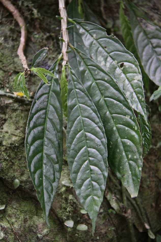 | 葉兩列狀排列,2 型,通常較大的一枚為歪倒披針形或闊披針形,長 5~25 公分,寬 3.5~7 公分,先端漸尖或銳尖,基部楔形或漸狹形,略歪,全緣或有稀疏粗鋸齒,肉質或近似肉質,表裏兩面皆無毛茸,表面呈有光澤綠色,背面淡綠色,側脈 5~8 對,於表裏兩面皆隆起;鐘乳體線形,散生於表裏兩面;葉柄長 0.6~2.5 公分,粗厚,綠色,光滑無毛茸;另一型葉與大葉對生,極小,卵形或卵狀披針形,長 1~2 公分,寬 0.4~1 公分,先端銳尖,基部鈍,有短柄,早落性;托葉小,三角形,早落。 |