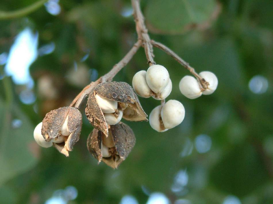 蒴果近球形,具三溝,9~11 月成熟,直徑約一公分,初為青綠,成熟時黑色,內藏白色種子三粒。 種子外有一層蠟,種仁含油20%臼蠟和臼油為主要的化工原料,可製蠟燭、肥皂,油漆等等。唯有毒不能食用。 |