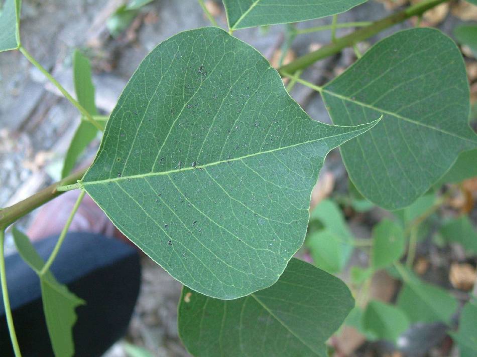 | 葉互生、菱形全緣、葉柄頂端具一對腺體。11~12 月葉色轉紅、黃,2~3月落葉。3 月萌發新芽。葉片有毒,不宜在魚塘四周栽培。葉菱狀卵形,長約五至九公分,全緣葉基與葉柄相接觸處有兩腺體,能分泌蜜汁,常見螞蟻在它們附近徘徊,跟螞蟻有共生的現象。 |
