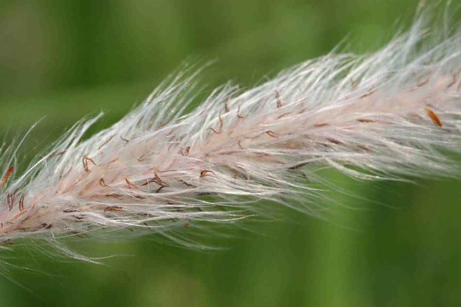 總狀花序多數,聚集成緊縮的圓錐花序,長 5~20 公分,寬 1.5~3 公分,分枝短縮密集,基部有時較疏或間斷。小穗圓筒狀,為基盤和穎的白色長絹毛所包住;穎膜質;上位外稃全緣;鱗被缺如;雄蕊 1~2 枚;小穗長約 0.3 公分,基部密生長 1~1.5 公分絲狀柔毛;下位內稃缺如。 |