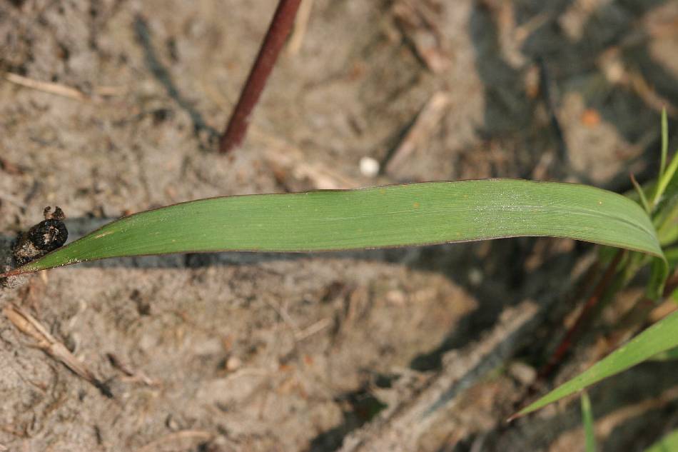 | 葉片披針形,邊緣通常內捲,基部有毛;葉舌短膜,鈍頭。葉鞘老時在基部常破碎成纖維狀;葉舌長約 l 公分;葉片扁平,頂端漸尖,基部漸狹,主脈明顯突出於背面,並向基部漸粗大而質硬,長 50~60 公分,寬 0.2~0.8 公分,背面及邊緣粗糙。 |