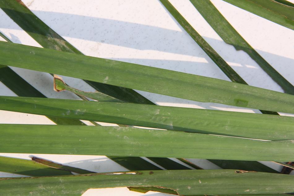 葉劍形,側扁,2 列排列,無柄,具葉鞘;葉基對折,兩側膜質鞘棕色,下部寬 0.2~0.3 公分,上延至葉片中部以下,漸狹,脫落;葉片質地較厚,線形,綠色,長 20~30 公分,極狹,寬不足 0.6 公分,先端長漸尖,無中肋,平行脈多數。