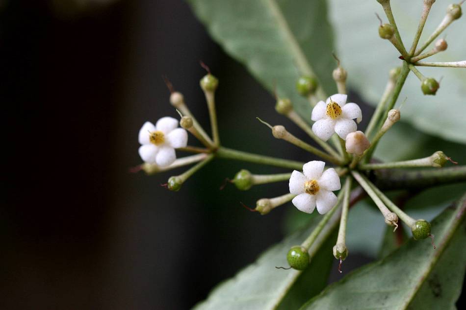 花 4~8 枚,白色或粉紅色,長 0.4~0.6 公分,呈簡單或複合的繖形花序或聚繖花序;花序多頂生莖上部開花的枝條,頂生,側生或腋生,長 10~16 公分,散生有葉片或葉狀苞片;萼片裂片長橢圓狀卵形,長 0.15~0.18 公分,先端圓或鈍,全緣,散生斑點,光滑無毛;花瓣卵形,長 0.5~0.6 公分,先端銳,有斑點及小腺點;雄蕊短於花瓣,花絲甚短,厚;花藥三角狀披針形,銳尖,背部有明顯散生的斑點。 |