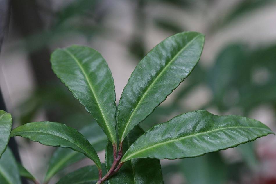 | 葉橢圓狀披針形或倒披針形,長 7~18 公分,寬 2~4 公分,革質或厚紙質,波狀緣或皺折,少數亦有全緣,巨大型的緣生腺體,光滑無毛,表面呈有光澤綠色,被面淡綠色,背面有隆起的斑點及散生鱗屑;側脈 12~18 對,細微,略隆起於背面,常伸展至葉緣,與不明顯緣生的葉脈相連;葉脈細長,長 0.7~1.4 公分,光滑無毛。 |