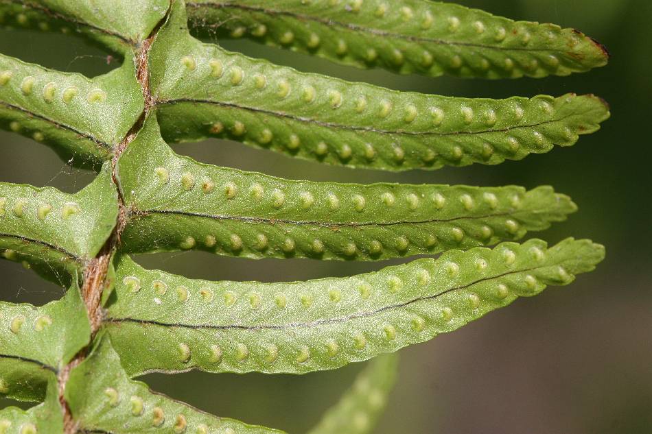 | 一回羽狀複葉,叢生;葉柄長 6~25 公分,幼嫩時密被赤褐色毛狀鱗片,鱗片全緣,窄線形,葉軸具縱溝,上部被鱗片;葉片長 25~65 公分,寬 2~6 公分,羽狀裂,羽片無柄,羽軸有節,羽片長 1~4 公分,寬 1~2 公分,基部不等形,葉耳銳尖,上下表面近乎光滑,下部羽片鈍形,通常較短,上部羽片著生孢子囊堆,長約 3~4 公分,略尖銳,邊緣細鋸齒至細鈍鋸齒。 | |