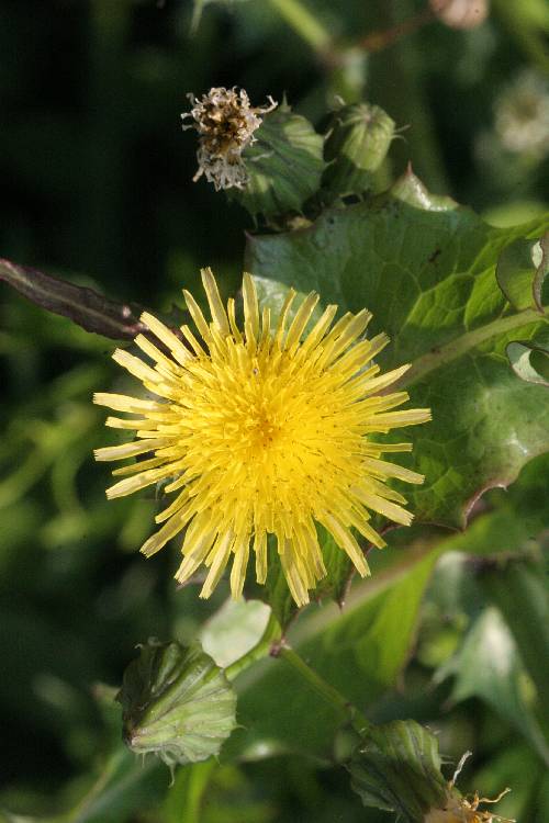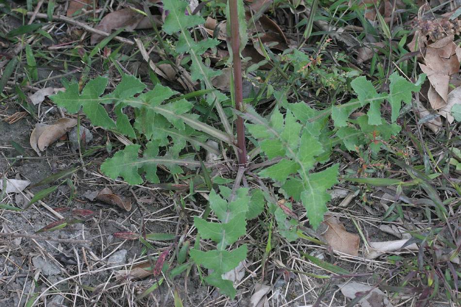 | 葉片長 8~20公分,寬 5~10 公分,三角狀卵形,葉尖銳或鈍,葉基狹窄或呈抱莖形,葉緣不整齊羽狀淺裂至深裂,上下表面皆無毛毛,葉背稍帶粉白;上部莖生葉長橢圓形至披針形。莖葉及花序均具有白色乳液。 |
