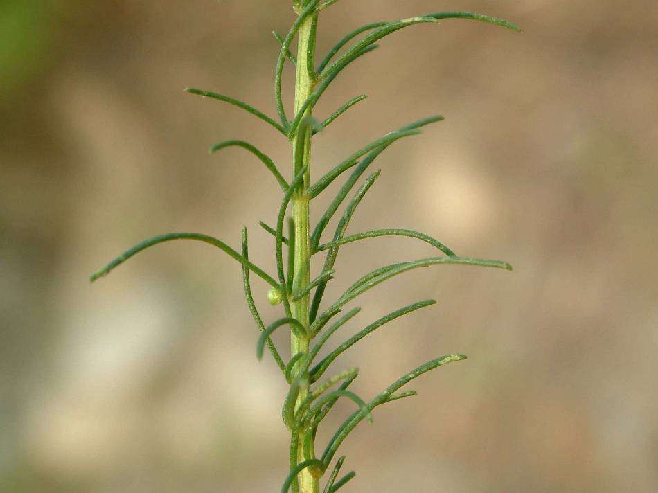 | 根生葉有柄,葉片長 3~6 公分,寬 0.2~0.4 公分,二回羽狀深裂,表面密被白色長柔毛;莖生葉無柄,寬 0.02~0.2 公分,羽狀全裂,裂片如細針狀。 |