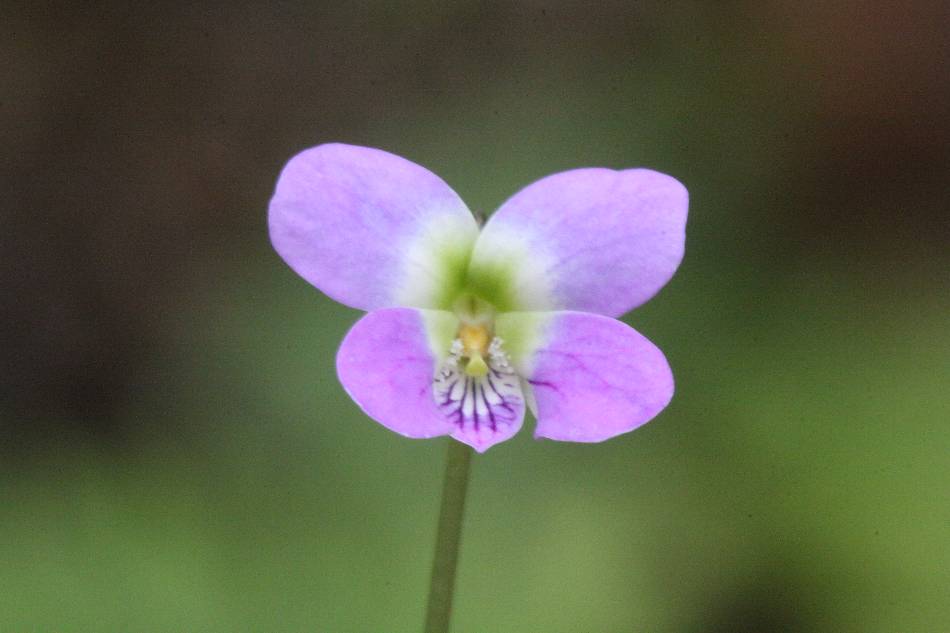 | 花較小,白色至淡紫色,頂生,開放時徑 1~1.2 公分;花梗長 2.5~8 公分,細長,光滑或略有毛茸;萼片 5 枚,狹卵形至闊披針形,長 0.3~0.4 公分,寬 0.1~0.15 公分,先端漸尖,具流蘇狀緣毛;附屬物圓、短,長 0.03~0.04 公分,邊緣有細絲毛緣;花瓣 4 枚(不含下位花瓣)倒卵形,長 0.5~0.8 公分,寬 0.2~0.3 公分,先端圓或鈍,側位花瓣有鬚毛;唇瓣(下位花瓣)最小,暗藍色或近似暗藍色,長 0.3~0.5 公分,寬 0.15~0.25 公分,先端銳尖;距長約 0.1~0.2 公分,先端圓鈍;花柱為明顯的棍棒狀,長 0.1~0.14 公分,基部有關節,先端有二枚側生的裂片。 | |