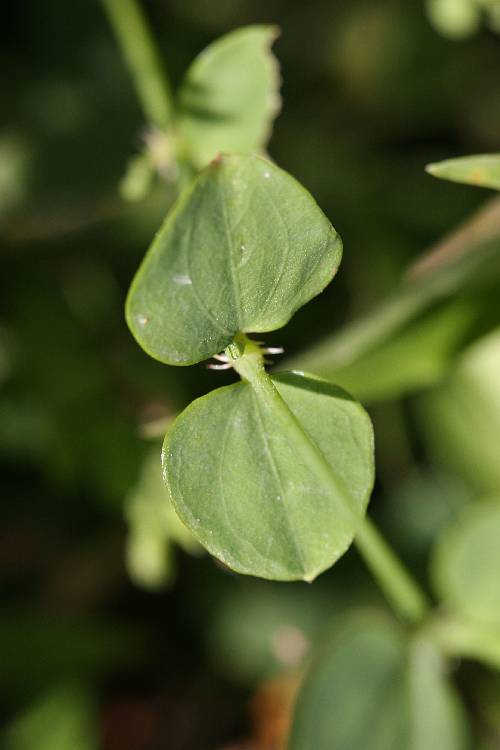 單葉,對生,具短柄;葉片長 0.5~2.5 公分,寬 0.5~2.5 公分,卵圓形或心形,先端微凸,葉基鈍心形,全緣,具 3 條主脈,具有膜質絲狀裂的托葉。 |