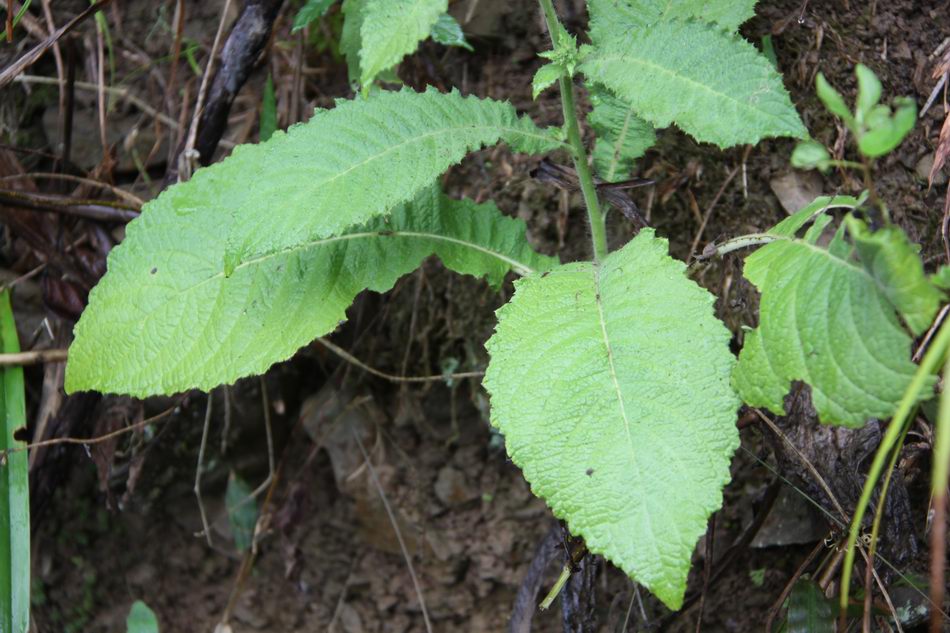 | 下部葉近無柄,倒卵形、倒披針形或橢圓形,長 20~40 公分,寬 6~10 公分,基部漸狹,頂端短尖,邊緣有不規則粗細相同的鋸齒,在兩粗齒間有 3~5 個細齒,上面被疏糙毛,下面被糙伏毛,脈上的毛較密,雜有多數腺體,側脈 10~16 對,在下面多少凸起,有明顯的網脈;中部葉倒卵狀長圓形或長橢圓形,長 12~20 公分,寬 4~8 公分,基部漸狹,下延,有時多少抱莖;上部葉較小,披針形或卵狀披針形。 |