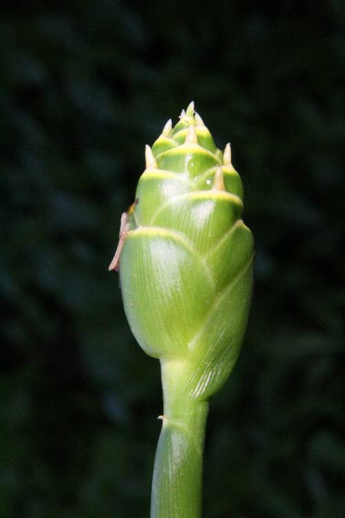 花莖自根莖長出,長 15~30 公分,穗狀花序橢圓形,長 4~6 公分,徑 1.5~3 公分,花稠密;花苞覆瓦狀,苞片卵圓形,長 2~2.5 公分,先端稍硬尖,綠白色,背面邊緣黃色;花萼管狀,長約 1 公分,具 3 短齒;花冠乳黃色至綠黃色,長管狀,管長 2~2.5 公分,裂片 3 枚,披針形,唇瓣長橢圓狀卵形,帶紫色,被黃白色斑點;雄蕊略帶紫色;子房 3 室,花柱被花葯抱著;熱帶地區當根狀莖瘦小時才抽花莖,頂端著生淡黃色花苞。 |