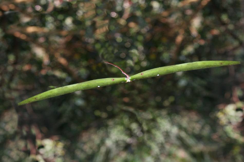 | 果實為蓇葖果,肥厚,銳尖形,長 10~15 公分,寬 0.3~0.5 公分,青綠色;蓇葖果 2 枚,叉開成一直線,外果皮有明顯斑點。種子長圓形,先端具絹質種毛。 |