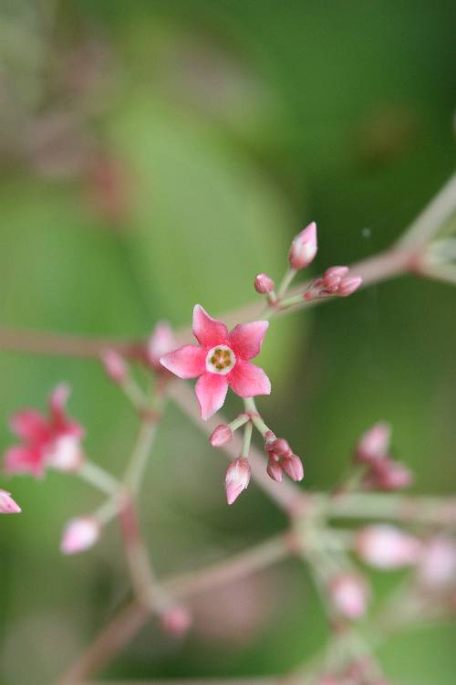 花序為聚繖狀圓錐花序,頂生,花數甚多;花淡紅色;花萼細小,長約 0.2 公分,深 5 裂;腺體 5 顆;花冠闊鐘形,徑 0.3~0.4 公分,深 5 裂或 4 裂,裂片倒披針形,淡紅色;雄蕊 5 枚,著生冠筒基部,不挺出於花外;花盤環狀,全緣不分裂;花柱先端膨大,子房 2 枚,有毛茸,2 室,每室胚珠多數。 |