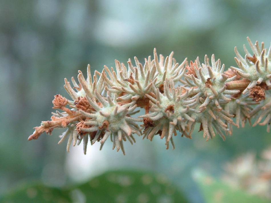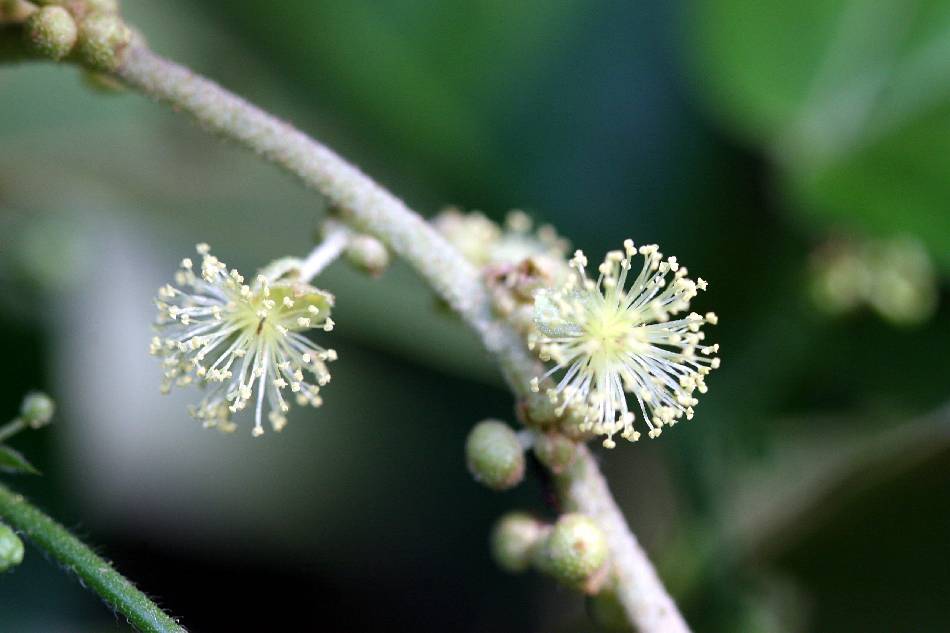 | 花小,多數,雌雄異株,呈頂生的複穗狀花序;雄花序長 12~20 公分,有毛茸;花無梗;花萼卵形,先端 3 裂,裂片圓形,長 .015~0.2 公分,先端鈍;雄蕊多數,花絲短,離生;花藥背生;雌花序長 1~1.5 公分,直立或近似直立,圓柱型;花萼 3 裂,裂片卵形,長 0.15~0.2 公分;子房球形,帶有軟刺,3 室;花柱短, 3~4 裂。春至夏季開花。 | |