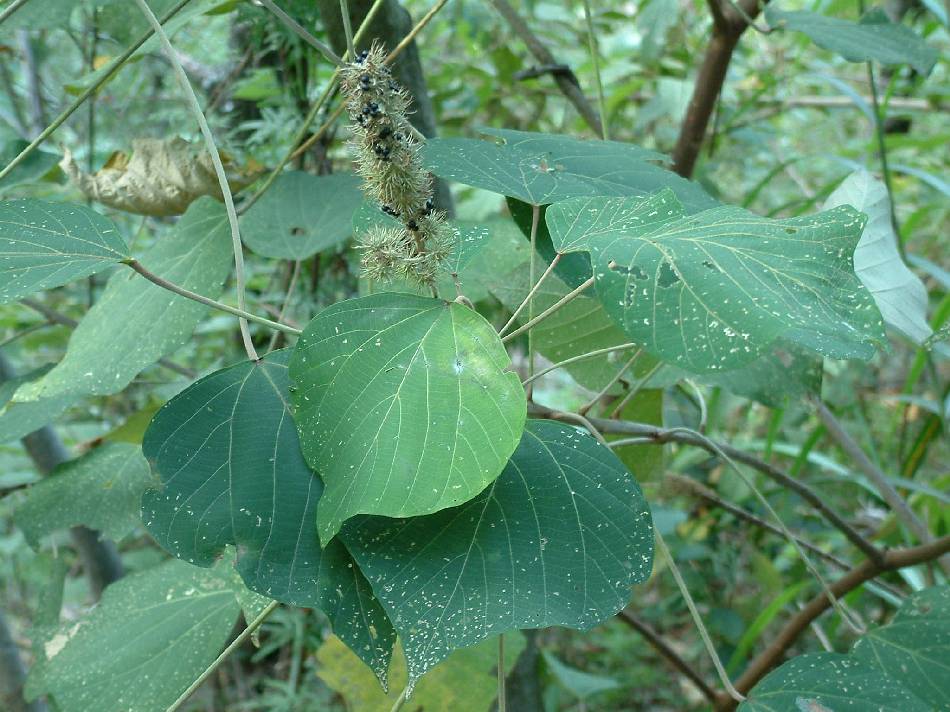 | 嫩葉與芽密生紅褐色絨毛,葉互生,卵形或闊卵形,末端成尾狀,上半部有時作 3 淺裂,長 7~20 公分,寬 5~15 公分,先端銳尖,基部圓形或淺心形,主脈 3 條,葉背淡黃綠色,葉表基部有蜜腺,可分泌糖蜜供螞蟻取食,而螞蟻則為它驅除蟲害,形成互利共生的關係,葉柄很長。 |