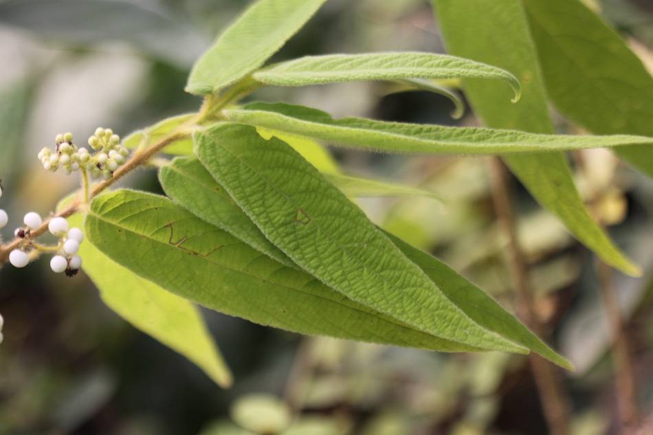 | 葉為單葉對生,線狀披針形至狹長橢圓,有時呈倒披針形,長 15~27 公分,寬 6~8 公分,先端尾狀銳尖,基部狹或楔形,細鋸齒緣,膜質;表面呈有光澤綠色,背面淡綠色,表裏兩面皆密被星狀軟毛;中肋於表面凹下而於背面隆起,側脈每邊 13~17 枚,略細緻;葉柄長 1.5~3 公分,有毛茸。 |