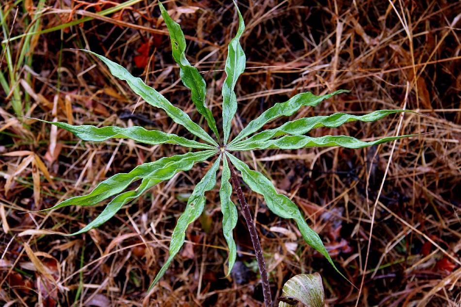 學名: Arisaema consanguineum Schott 科屬: 天南星科(Araceae)天南星屬(Arisaema) 母語:Takarairi傀儡(魯凱)(排灣) 用途:腫瘍,將葉烤熟後貼於患部並以布包紮之(魯凱) 腹痛,取球根搗碎後煎服之(魯凱)(排灣) |