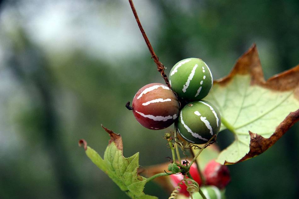 | 果實為漿果,球形,單生或 2~3 出,幾乎無柄,徑 1.5~2.2 公分,綠色具白色條紋,成熟時紅色而有白色條紋;種子卵圓形褐色,扁平,中間有一環帶,0.5~0.7 公分。果期 8~10 月。 |