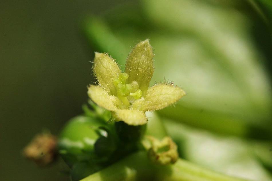 | 單性花,雌雄同株而異花,雌雄花常各數朵簇生於同一葉腋;雄花花梗小於 2.5 公分,萼筒五齒裂,裂片錐形;花冠五片,黃綠色;雄蕊 3 枚,花藥離生;雌花花萼及花冠與雄花同,子房卵圓形,柱頭 3 淺裂。花期 3~8 月。 | |