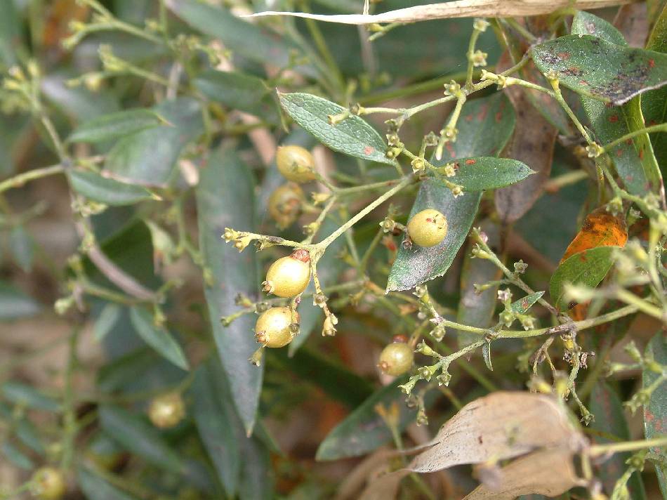 果實為核果,球形,徑 0.5~0.6 公分,有光澤,先端有殘存的花萼,具 2 枚分核;種子 2 枚,多少為扁平。