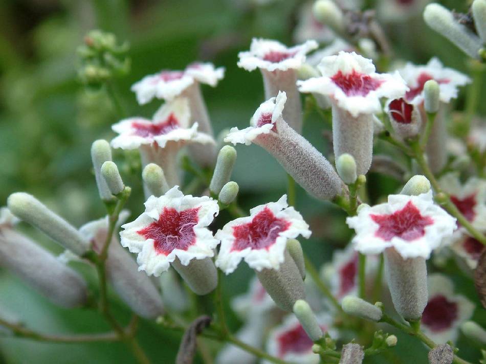花多數,中型,開放時徑 0.5~0.7 公分,呈腋生的聚繖花序排列,再由多數的聚繖花序排列為圓錐花序狀;花序長 5~15 公分;花柄細長,長 0.1~0.2 公分;苞片小,早落性;花萼壺形,長 0.2~0.25 公分,先端 5 齒裂或全裂,殘存性;花冠闊筒狀或細長筒狀,長 1~1.5 公分,外面白色,有毛茸,內面粉紅色或暗紫色,有絨毛或白色腺毛,先端 5 裂;裂片卵形,長 0.4~0.5 公分,先端鈍;雄蕊 5 枚,不伸出冠筒外;花絲線形,下半部與冠筒相連,先端離生;花藥長橢圓形,背生;子房下位,2 室,每室有胚珠 1 枚;柱頭 2 裂,頭狀;花期在夏、秋季。