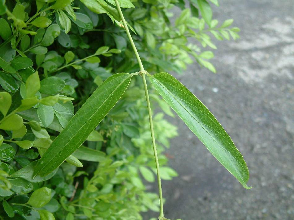 單葉對生,長橢圓狀披針形至橢圓狀卵形,長 4~12 公分,寬 2.5~5.5 公分,先端銳尖,基部圓或心形,紙質,全緣;表面呈有光澤的綠色,背面淡綠色;表裡兩面皆光滑無毛,但有時亦疏生毛茸;中肋於表面凹下而於背面隆起,側脈每邊 6~9 枚及細脈皆略明顯而細緻;葉柄長 1~5 公分,圓柱形,光滑無毛茸;托葉三角形,長 0.3~0.5 公分,早落性。
