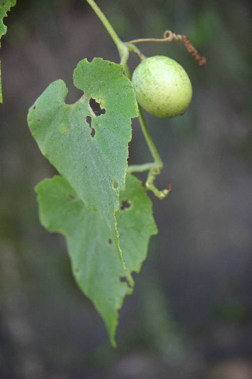 | 葉有柄,互生,卵圓形至闊圓形,長 6~15 公分,寬 5~12 公分,先端漸尖,基部深心形;膜質,葉緣有細鋸齒,上表面粗糙,下表面具長絨毛;葉柄長 4~12 公分,有毛茸;捲鬚單生至二分裂,與葉對生,略有毛茸。 |