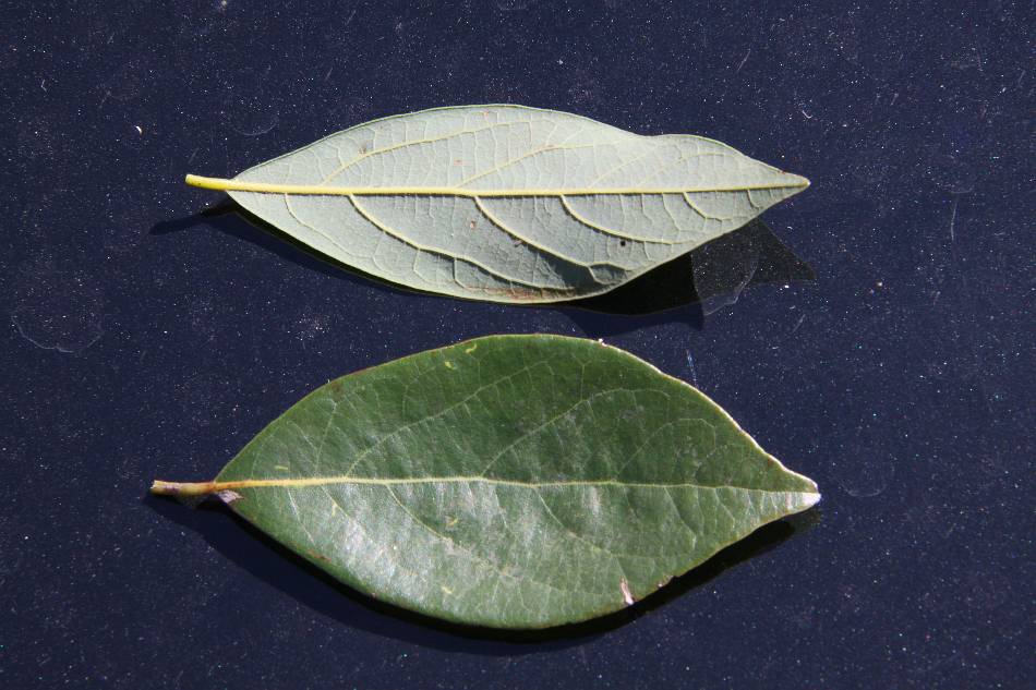 | 葉互生,柄長 0.6~0.8 公分,被硬毛,葉片革質,橢圓形或倒披針形,長 5~9 公分,寬 2~4 公分,基部銳形或鈍形,先端漸尖或急銳尖形,全緣,主脈及側脈稍凹陷,背面隆起,側脈 5~8 對,表面細脈不明顯,無毛,葉背被軟毛。 |