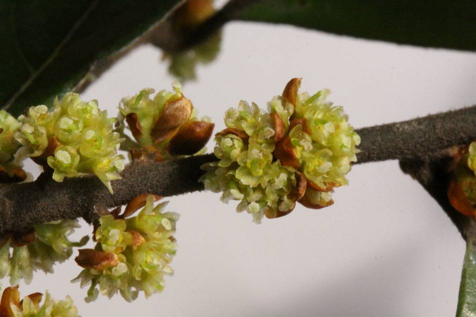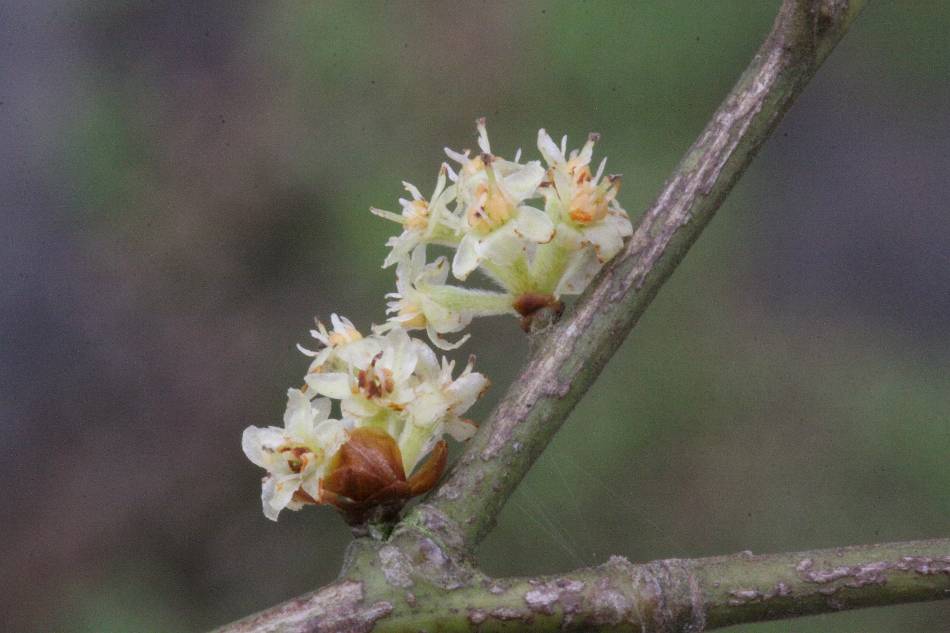 | 花淡黃色,雌雄異株,生長於枝條先端的葉腋或葉下無葉的枝條上,花 5~6 朵呈小繖形花序排列,花序未開放前有總苞片 4 枚包被;總苞早落,卵形,長 0.3~0.4 公分,先端鈍,外側被軟毛;小花梗長 0.2~0.4 公分,被硬毛;雄花花被 6 片,鐘狀,長 0.1~0.15 公分,裂片橢圓形,先端鈍形,外側稍被軟毛;完全雄蕊 9 枚,花絲長 0.1~0.3 公分,無毛,第 3 輪雄蕊花絲具腺體,長約 0.05 公分,具柄,花藥 2 室,內向;第 4 輪雄蕊退化成柱狀;子房發育不全,卵形至長橢圓形,長 0.1~0.15 公分,光滑無毛或基部被毛;雌花花被 2 片,長橢圓形或三角形,先端鈍形,退化雄蕊第 3 輪花絲具腺體,長 0.05~0.1 公分,子房卵形,光滑無毛,長 0.1~0.15 公分。 | |