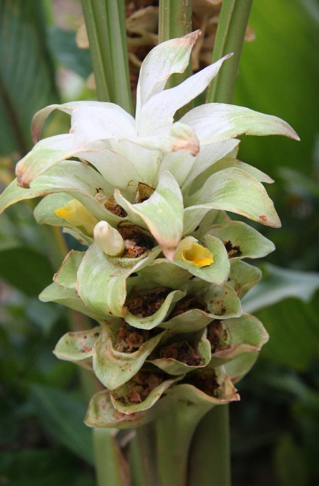 | 花葶由根莖生出,具鞘狀葉,穗狀花序圓錐形,長約 15 公分;下部有花苞片,卵形,淡綠色,小花數朵;上部無花,苞片長圓形,白色帶紅暈,頂端常具小尖突,被毛;花萼筒形,白色被疏毛,3 淺裂;花冠漏斗形,長 2.3~2.5 公分,花冠管細,3 裂瓣;上側一片較大;退化雄蕊長橢圓形,黃色;子房被伏毛,花柱絲狀,基部 2 枚棒狀附屬物,柱頭 2 歧。花期 4~7 月。 | |