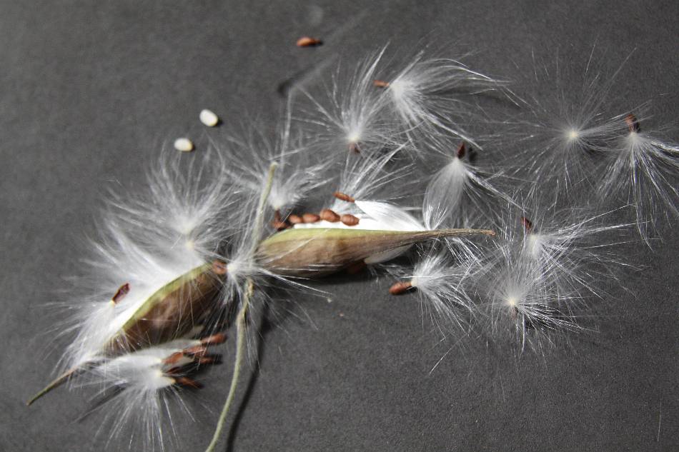 | 蓇葖果條狀角形或瓜條形,長約 12 公分,綠色光滑,黑熟後從中間開裂,種子卵狀長橢圓形,扁平,有長 4~6 公分帶絲狀之種芒。 |